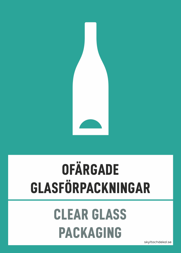 Symbol för ofärgade glasförpackningar i avfallshantering med rubrik på svenska och engelska. Välj mellan självhäftande dekal, plastskylt eller aluminiumskylt i olika storlekar och fästmetoder.